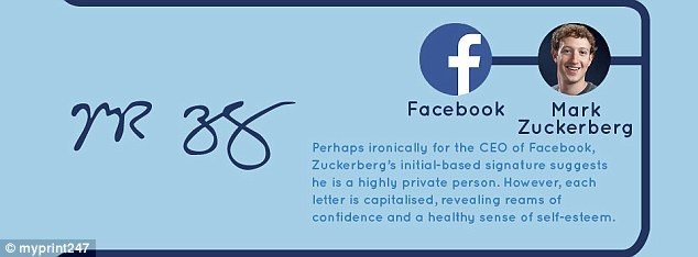 Ο ιδρυτής του Facebook υπογράφει χρησιμοποιώντας μόνο τα αρχικά του και μάλιστα με κεφαλαία. Αυτό σημαίνει ότι είναι πολύ κλειστός χαρακτήρας, γεμάτος αυτοπεποίθηση αλλά και αυτοεκτίμηση.