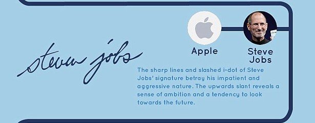 Η υπογραφή του ιδρυτή της Apple Στιβ Τζομπς, από την άλλη, είχε αιχμηρές γραμμές και ανοδική κλίση, κάτι που αποκάλυπτε άτομο φιλόδοξο, διορατικό, ανυπόμονο και επιθετικό από τη φύση του.