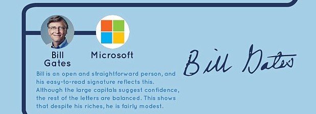 Ο ιδρυτής της Microsoft Μπιλ Γκέιτς έχει μια άκρως ισορροπημένη υπογραφή που αντανακλά έναν ευθύ και ήπιων τόνων χαρακτήρα.