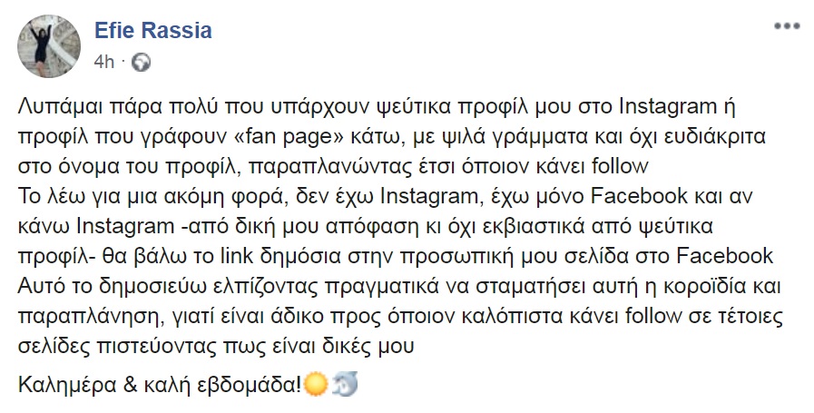 «Λυπάμαι πάρα πολύ που υπάρχουν ψεύτικα προφίλ μου στο Instagram ή προφίλ που γράφουν «fan page» κάτω, με ψιλά γράμματα και όχι ευδιάκριτα στο όνομα του προφίλ, παραπλανώντας έτσι όποιον κάνει follow. Το λέω για μια ακόμη φορά, δεν έχω Instagram, έχω μόνο Facebook και αν κάνω Instagram -από δική μου απόφαση κι όχι εκβιαστικά από ψεύτικα προφίλ- θα βάλω το link δημόσια στην προσωπική μου σελίδα στο Facebook. Αυτό το δημοσιεύω ελπίζοντας πραγματικά να σταματήσει αυτή η κοροϊδία και παραπλάνηση, γιατί είναι άδικο προς όποιον καλόπιστα κάνει follow σε τέτοιες σελίδες πιστεύοντας πως είναι δικές μου. Καλημέρα & καλή εβδομάδα!» , έγραψε χαρακτηριστικά.