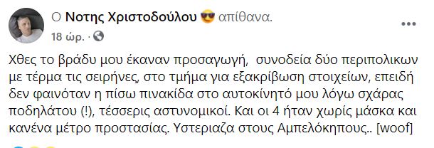 «Χθες το βράδυ μου έκαναν προσαγωγή, συνοδεία δύο περιπολικών με τέρμα τις σειρήνες, στο τμήμα για εξακρίβωση στοιχείων, επειδή δεν φαινόταν η πίσω πινακίδα στο αυτοκίνητό μου λόγω σχάρας ποδηλάτου (!), τέσσερις αστυνομικοί. Και οι 4 ήταν χωρίς μάσκα και κανένα μέτρο προστασίας. Υστερίαζα στους Αμπελόκηπους…».
