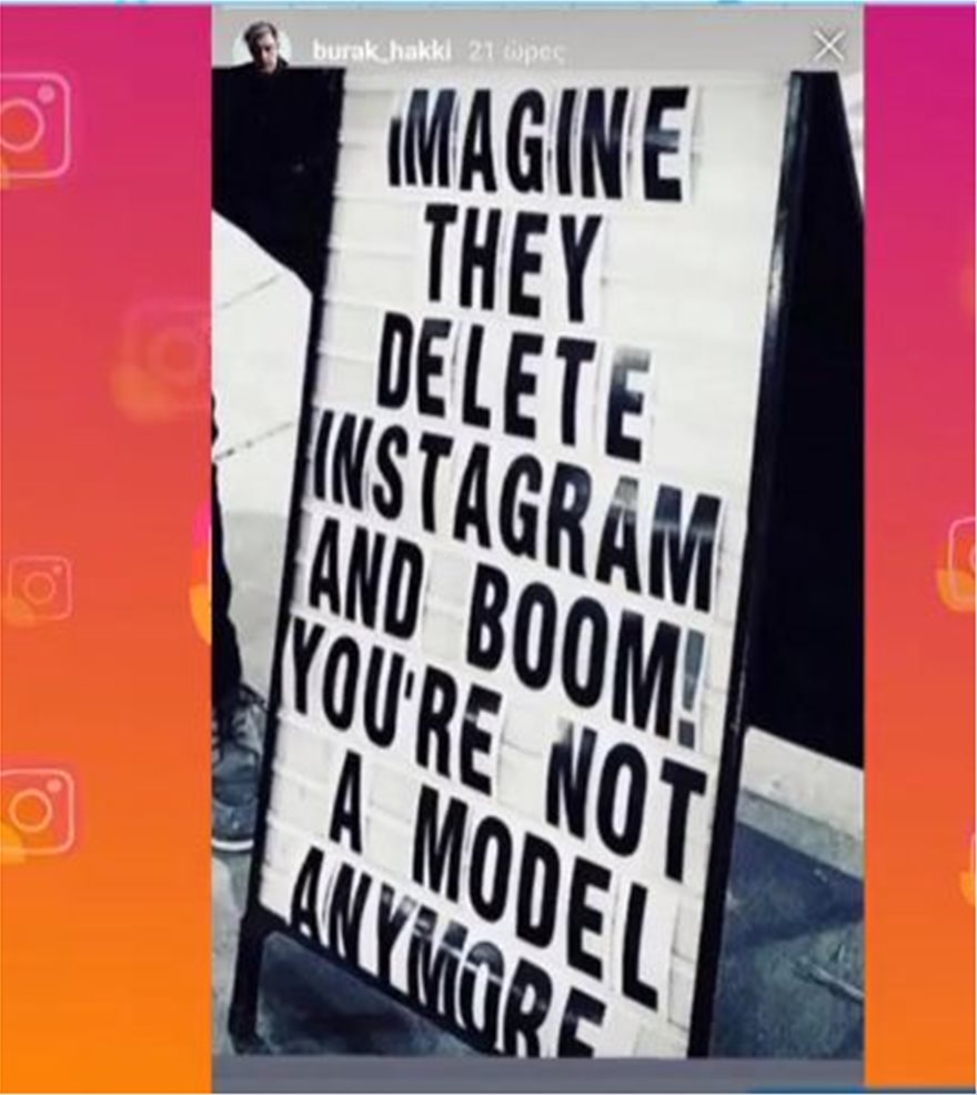 Μάλιστα με ένα instastory του Μπουράκ Χακί που αναφέρει: «Φαντάσου πως διαγράφουν το Instagram και… μπουμ. Δεν είσαι πια μοντέλο» , οι περισσότεροι σχολίασαν ότι στέλνει ένα έμμεσο μήνυμα στην πρώην αγαπημένη του.