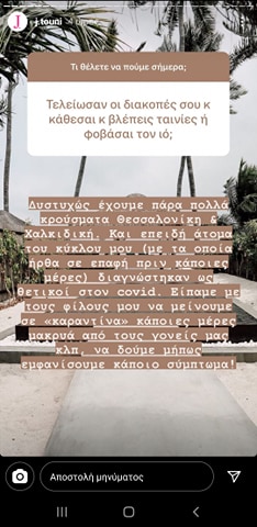 Η ίδια αποκάλυψε πως ο λόγος που τόσο εκείνη όσο και οι φίλοι της μπήκαν σε καραντίνα είναι γιατί κάποια από τα άτομα που ήρθαν σε επαφή τις τελευταίες ημέρες βγήκαν θετικοί στον κορωνοϊό.