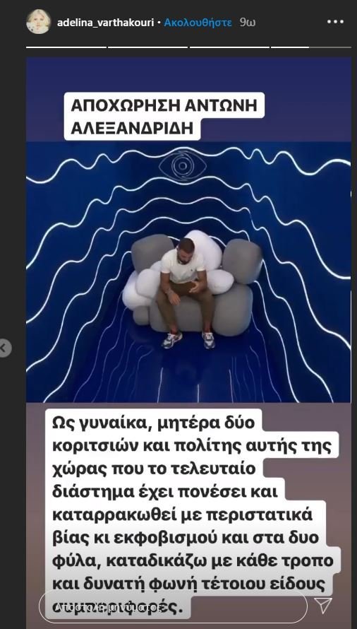 Η σύζυγος του Χάρη, Αντελίνα Βαρθακούρη έκανε μια ανάρτηση σχολιάζοντας την αποχώρηση του παίκτη από το Big Brother και το σχόλιο περί βιασμού, αναφέροντας τις κόρες της και καταδικάζοντας περιστατικά βίας και εκφοβισμού.
