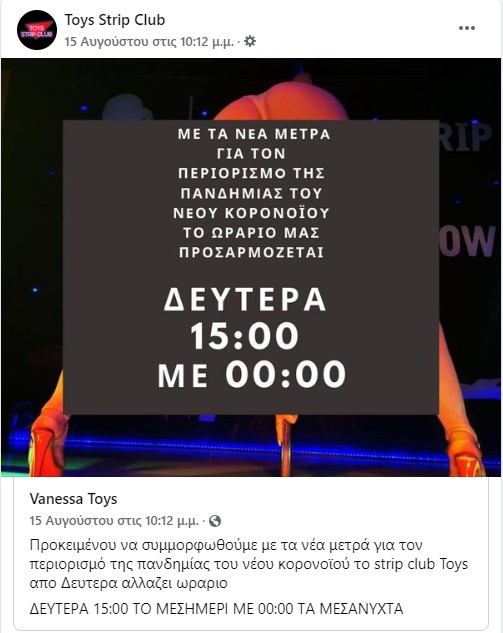 Μπορεί τα μπουζούκια να άνοιξαν το δρόμο για ψυχαγωγικό πρόγραμμα από νωρίς το απόγευμα, ωστόσο, φαίνεται πως και τα μαγαζιά αισθησιακού χορού αλλάζουν το ωράριό τους λόγω των περιοριστικών μέτρων.