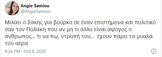 «Μιλάει ο Σάκης για βούρκο σε έναν επιστήμονα και πολιτικό σαν τον Πολάκη που αν μη τι άλλο είναι άψογος ο άνθρωπος… τι να πω, ντροπή του… έχουν πάρει τα μυαλά του αέρα» έγραψε χαρακτηριστικά η Αντζυ Σαμίου.