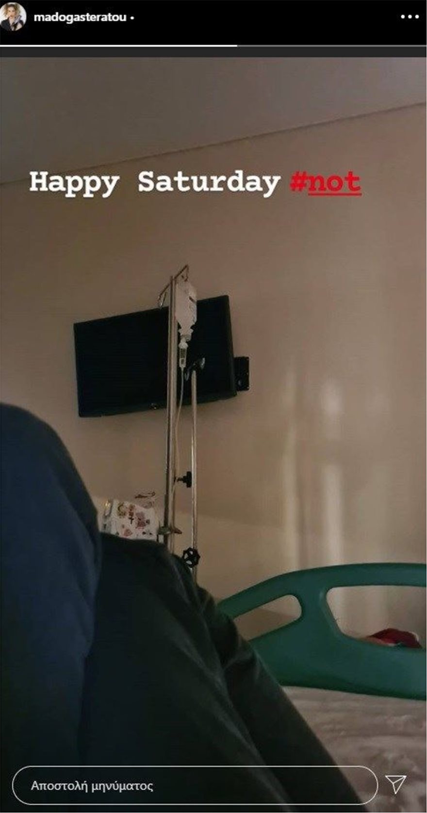 «Happy Saturday #not», έγραψε η Μαντώ Γαστεράτου στην εικόνα που ανέβασε. Η ίδια, ωστόσο, δεν θέλησε να δώσει περισσότερες λεπτομέρειες στους διαδικτυακούς της φίλους σχετικά με τον λόγο που χρειάστηκε να νοσηλευτεί.