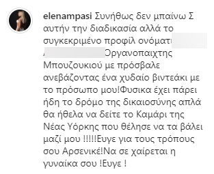 “Συνήθως δεν μπαίνω Σ αυτήν την διαδικασία αλλά το συγκεκριμένο προφίλ ονόματι S A Οργανοπαιχτης Μπουζουκιού με πρόσβαλε ανεβάζοντας ένα χυδαίο βιντεάκι με το πρόσωπο μου!Φυσικα έχει πάρει ήδη το δρόμο της δικαιοσύνης απλά θα ήθελα να δείτε το Καμάρι της Νέας Υόρκης που θέλησε να τα βάλει μαζί μου !!!!!Εύγε για τους τρόπους σου Αρσενικέ!Να σε χαίρεται η γυναίκα σου !Εύγε”!