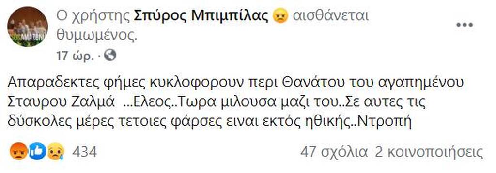 Χαρακτηριστικά έγραψε: «Απαράδεκτες φήμες κυκλοφορούν περί θανάτου του αγαπημένου Σταύρου Ζαλμά. Έλεος. Τώρα μιλούσα μαζί του. Σε αυτές τις δύσκολες μέρες τέτοιες φάρσες είναι εκτός ηθικής. Ντροπή».