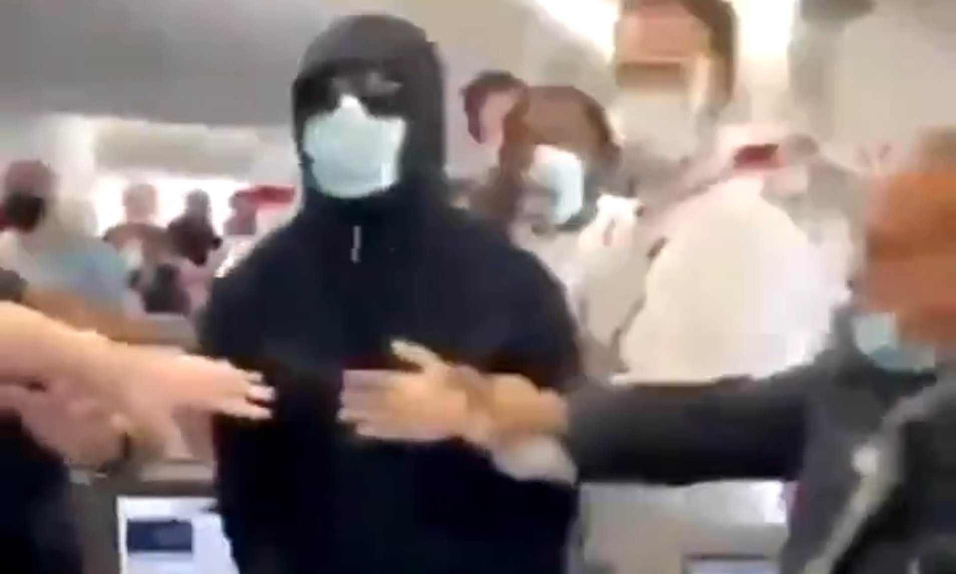 Και οι δύο άνδρες φορούν μάσκες στο βίντεο, όπως απαιτείται στα αεροπλάνα λόγω της πανδημίας του κορωνοϊού.