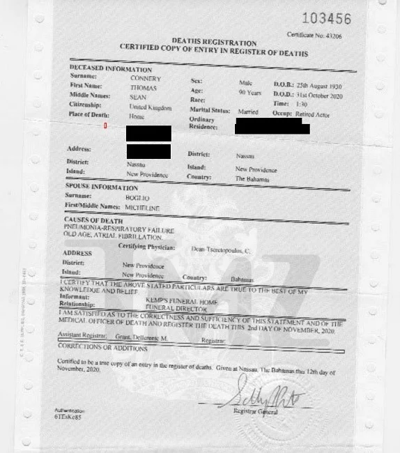 Το TMZ, απέκτησε το πιστοποιητικό, που δείχνει πώς πέθανε το αστέρι του Χόλιγουντ στο πολυτελές αρχοντικό του στο Νασάου του νησιού New Providence. Η σύζυγος του, Micheline Roquebrune, είχε προηγουμένως πει πως ο ηθοποιός πέθανε ειρηνικά στον ύπνο του και περιβαλλόταν από την οικογένειά του.