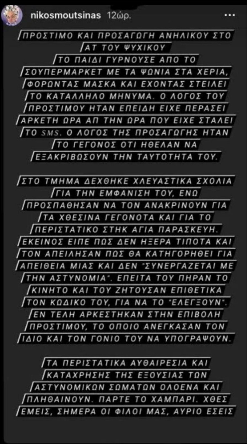 Ο παρουσιαστής, μέσω Instagram Story, μοιράστηκε περιστατικό που περιγράφει την προσαγωγή ανηλίκου στο Α.Τ. Ψυχικού. Οπως ανέφερε η ανάρτηση, αστυνομικοί έκοψαν πρόστιμο σε παιδί, που γυρνούσε από το σουπερμάρκετ, φορώντας μάσκα και έχοντας στείλει το κατάλληλο μήνυμα, επειδή είχε περάσει ώρα από την ώρα που είχε στείλει SMS. Στη συνέχεια, σύμφωνα πάντα με την ανάρτηση του Νίκου Μουτσινά, οι αρχές προχώρησαν στην προσαγωγή του καθώς ήθελαν να εξακριβώσουν τα στοιχεία του.