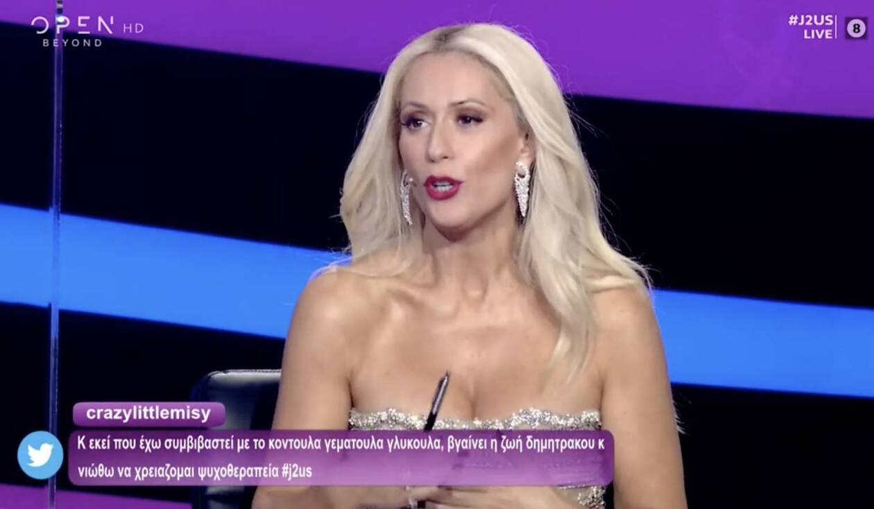 Η γνωστή παρουσιάστρια και κριτής του J2US Μαρία Μπακοδήμου, δεν άφησε κανέναν παραπονεμένο στο χθεσινό live, καθώς το «πληθωρικό» της μπούστο τράβηξε τα βλέμματα όλων.