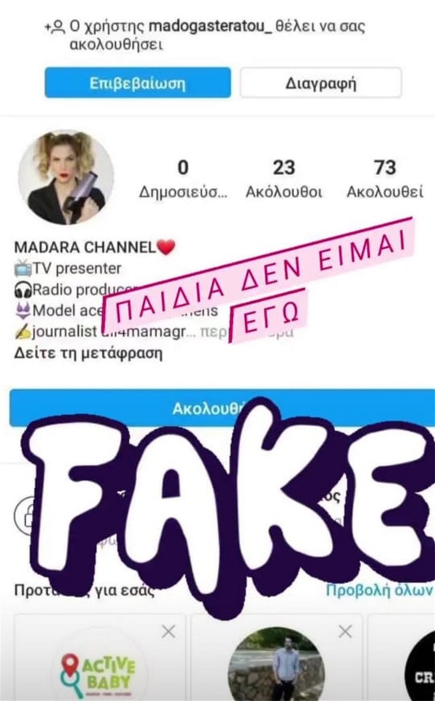 Η παρουσιάστρια και ραδιοφωνική παραγωγός εντόπισε στο Instagram ένα προφίλ που χρησιμοποιεί τις φωτογραφίες και τα στοιχεία της χωρίς, βέβαια, να είναι η ίδια. Η Μαντώ Γαστεράτου έσπευσε να ειδοποιήσει τους followers της γράφοντας: «Παιδιά δεν είμαι εγώ. Fake».