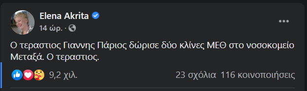 Σύμφωνα με τα λεγόμενά της ο Γιάννης Πάριος δώρισε δύο ΜΕΘ στο νοσοκομείο και η ίδια τον αποθέωσε μέσα από το ποστ της, ενώ το ίδιο έγινε και στα σχόλια αλλά και τα χιλιάδες ριάξιον και κοινοποιήσεις της είδησης για τη σπουδαία κίνηση του δημοφιλούς τραγουδιστή.