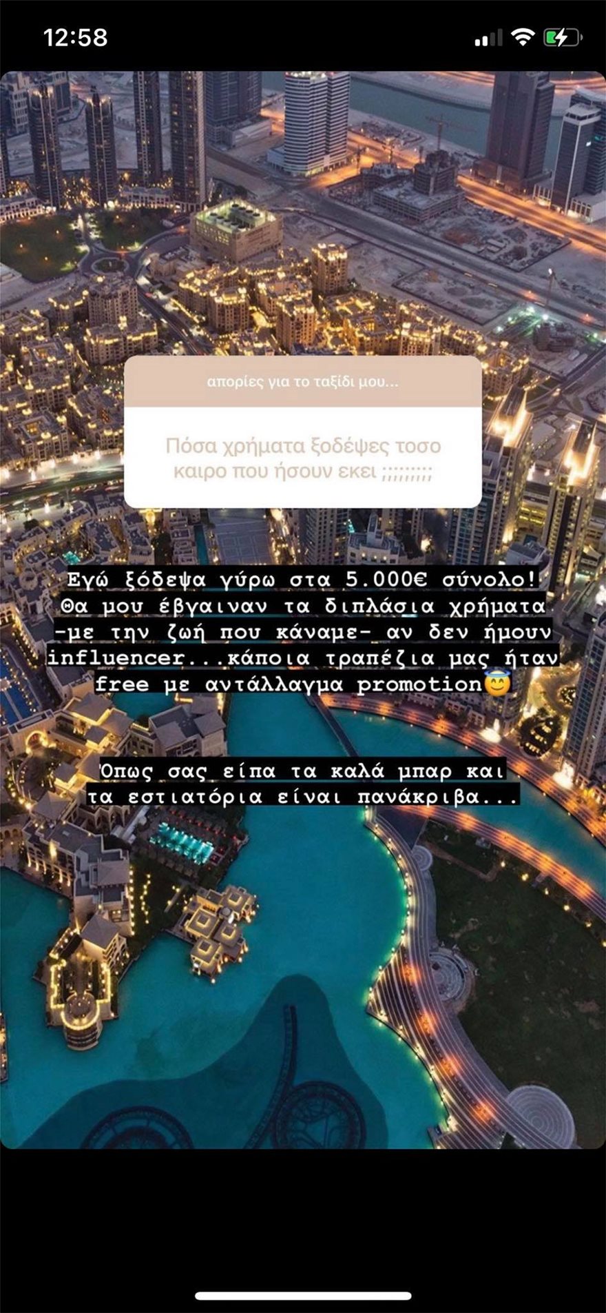 H επιχειρηματίας και influencer απάντησε σε όλες τις απορίες των ακολούθων της στο Instagram, μια εκ των οποίων είχε να κάνει με το πόσα χρήματα ξόδεψε όσο καιρό βρισκόταν εκεί.