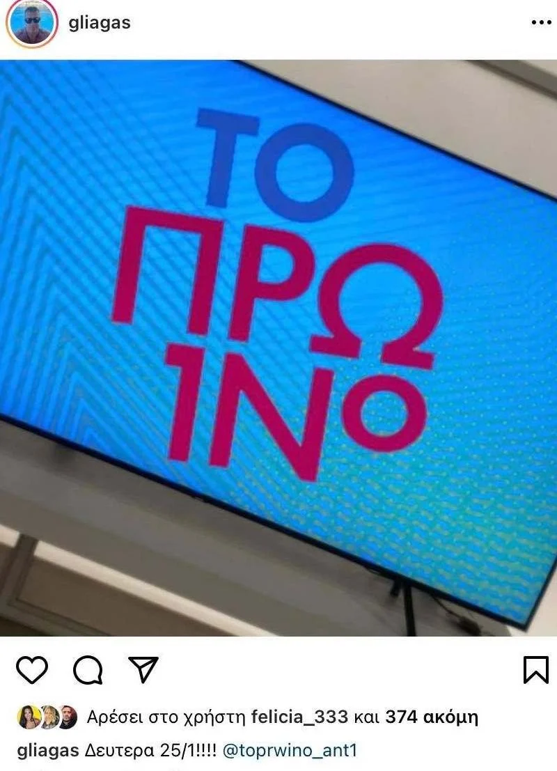Συγκεκριμένα, πόσταρε μια φωτογραφία με το σήμα του «Πρωινού» και έγραψε στη λεζάντα της δημοσίευσής του: «Δευτέρα 25/1!!!! @toprwino_ant1».