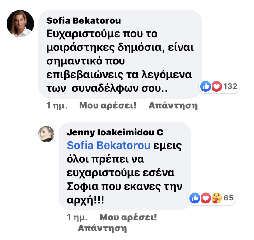 «Ευχαριστούμε που το μοιράστηκες δημόσια, είναι σημαντικό που επιβεβαιώνεις τα λεγόμενα των συναδέλφων σου», έγραψε σε σχόλιό της στο Facebook και η ηθοποιός απάντησε: «Εμείς όλοι πρέπει να ευχαριστούμε εσένα Σοφία που έκανες την αρχή».
