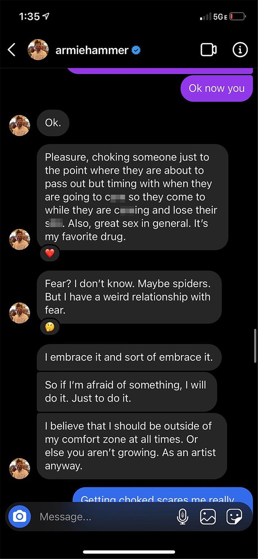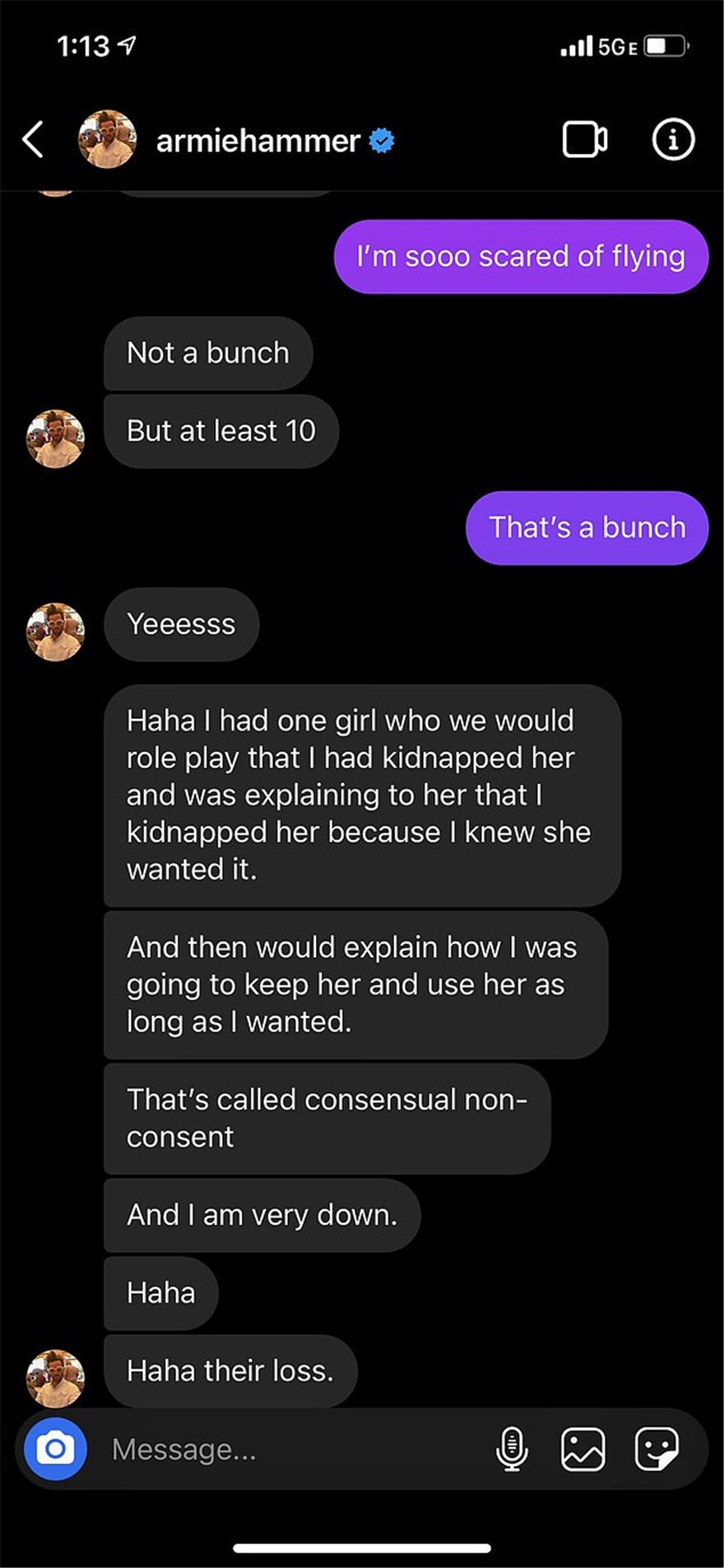 Σύμφωνα με την Daily Mail, την επόμενη ημέρα μετά τη διαρροή στο Instagram των μηνυμάτων που φέρεται να έστειλε σε πρώην του και έδιναν το «στίγμα» των ιδιαίτερων προτιμήσεών του στο κρεβάτι, ο Χάμερ έστειλε μήνυμα στη φίλη του γράφοντας ότι «είναι παρεμβατικό και σκατ@νιο να δέχεται kink shaming από το διαδίκτυο».