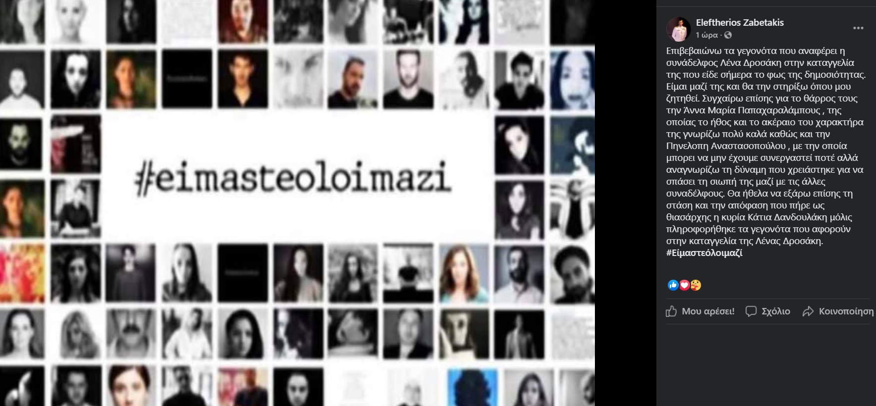«Επιβεβαιώνω τα γεγονότα που αναφέρει η συνάδελφος Λένα Δροσάκη στην καταγγελία της που είδε σήμερα το φως της δημοσιότητας. Είμαι μαζί της και θα την στηρίξω όπου μου ζητηθεί. Συγχαίρω επίσης για το θάρρος τους την Άννα Μαρία Παπαχαραλάμπους, της οποίας το ήθος και το ακέραιο του χαρακτήρα της γνωρίζω πολύ καλά καθώς και την Πηνελοπη Αναστασοπούλου, με την οποία μπορεί να μην έχουμε συνεργαστεί ποτέ αλλά αναγνωρίζω τη δύναμη που χρειάστηκε για να σπάσει τη σιωπή της μαζί με τις άλλες συναδέλφους. Θα ήθελα να εξάρω επίσης τη στάση και την απόφαση που πήρε ως θιασάρχης η κυρία Κάτια Δανδουλάκη μόλις πληροφορήθηκε τα γεγονότα που αφορούν στην καταγγελία της Λένας Δροσάκη».