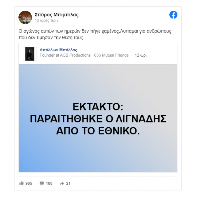 Ο πρόεδρος του Σωματείου Ελλήνων Ηθοποιών, Σπύρος Μπιμπίλας, με μία ανάρτηση στο προσωπικό του προφίλ στο Facebook, σχολίασε την απόφαση του Δημήτρη Λιγνάδη να παραιτηθεί από καλλιτεχνικός διευθυντής του Εθνικού Θεάτρου.