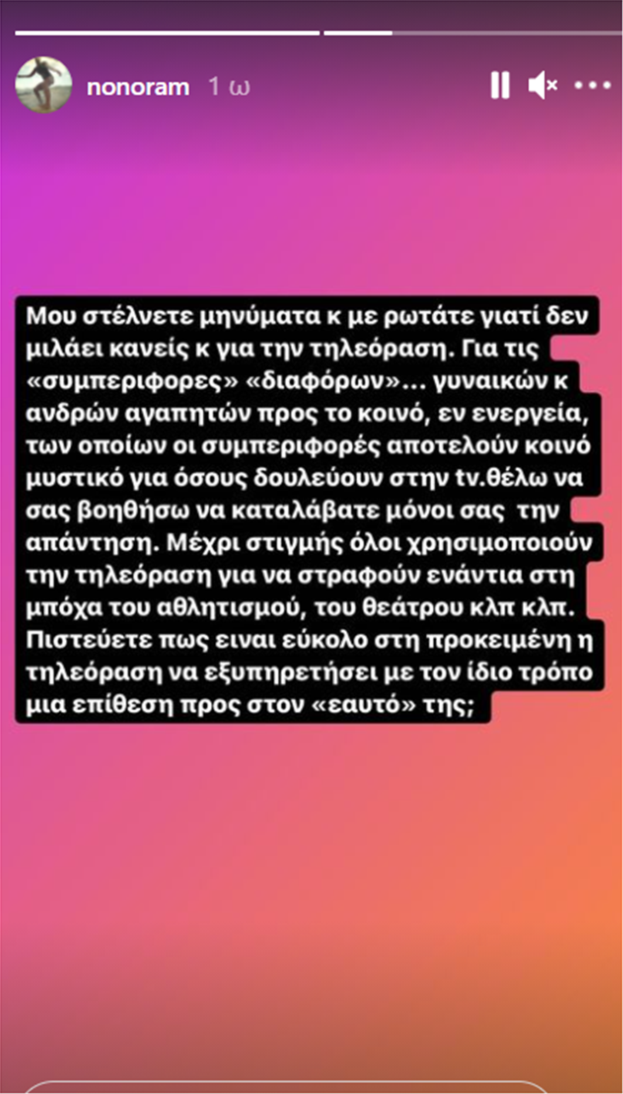 «Μου στέλνετε μηνύματα και με ρωτάτε γιατί δεν μιλάει κανείς και για την τηλεόραση. Για τις “συμπεριφορές” “διαφόρων”… γυναικών και ανδρών αγαπητών προς το κοινό, εν ενεργεία, των οποίων οι συμπεριφορές αποτελούν κοινό μυστικό για όσους δουλεύουν στην tv. Θέλω να σας βοηθήσω να καταλάβετε μόνοι σας την απάντηση. Μέχρι στιγμής όλοι χρησιμοποιούν την τηλεόραση για να στραφούν ενάντια στη μπόχα του αθλητισμού, του θεάτρου κλπ κλπ. Πιστεύετε πως είναι εύκολο στη προκειμένη η τηλεόραση να εξυπηρετήσει με τον ίδιο τρόπο μια επίθεση προς τον “εαυτό” της;».