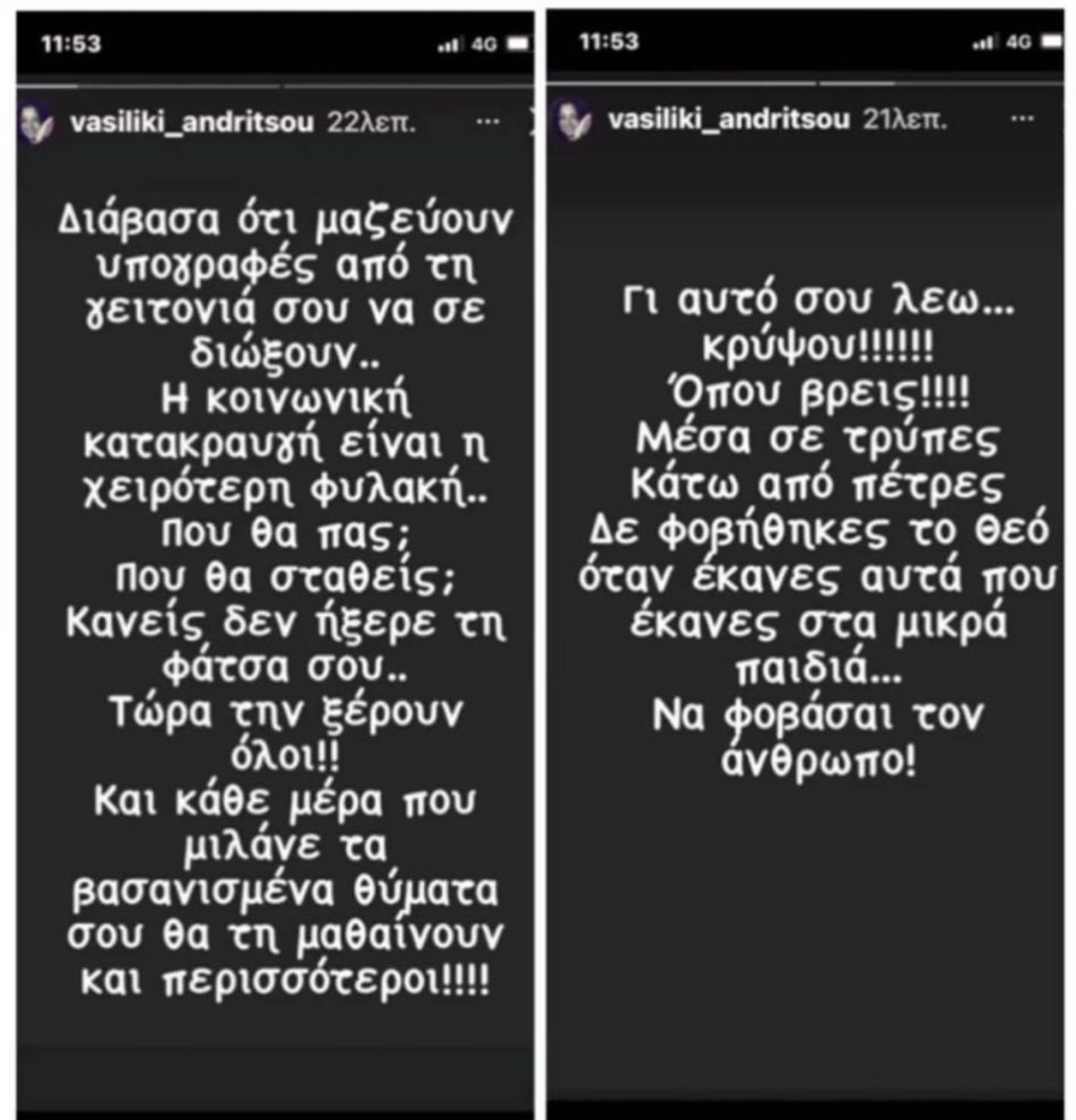 «Διάβασα ότι μαζεύουν υπογραφές από τη γειτονιά σου να σε διώξουν. Η κοινωνική κατακραυγή είναι η χειρότερη φυλακή… Που θα πας; Που θα σταθείς; Κανείς δεν ήξερε τη φάτσα σου… Τώρα την ξέρουν όλοι!!! Κάθε μέρα που μιλάνε τα βασανισμένα θύματά σου θα τη μαθαίνουν και περισσότεροι!!! Για αυτό σου λέω… κρύψου!!! Όπου βρεις!!! Μέσα σε τρύπες, κάτω από πέτρες. Δε φοβήθηκες τον Θεό όταν έκανες αυτά που έκανες στα μικρά παιδιά… Να φοβάσαι τον άνθρωπο».