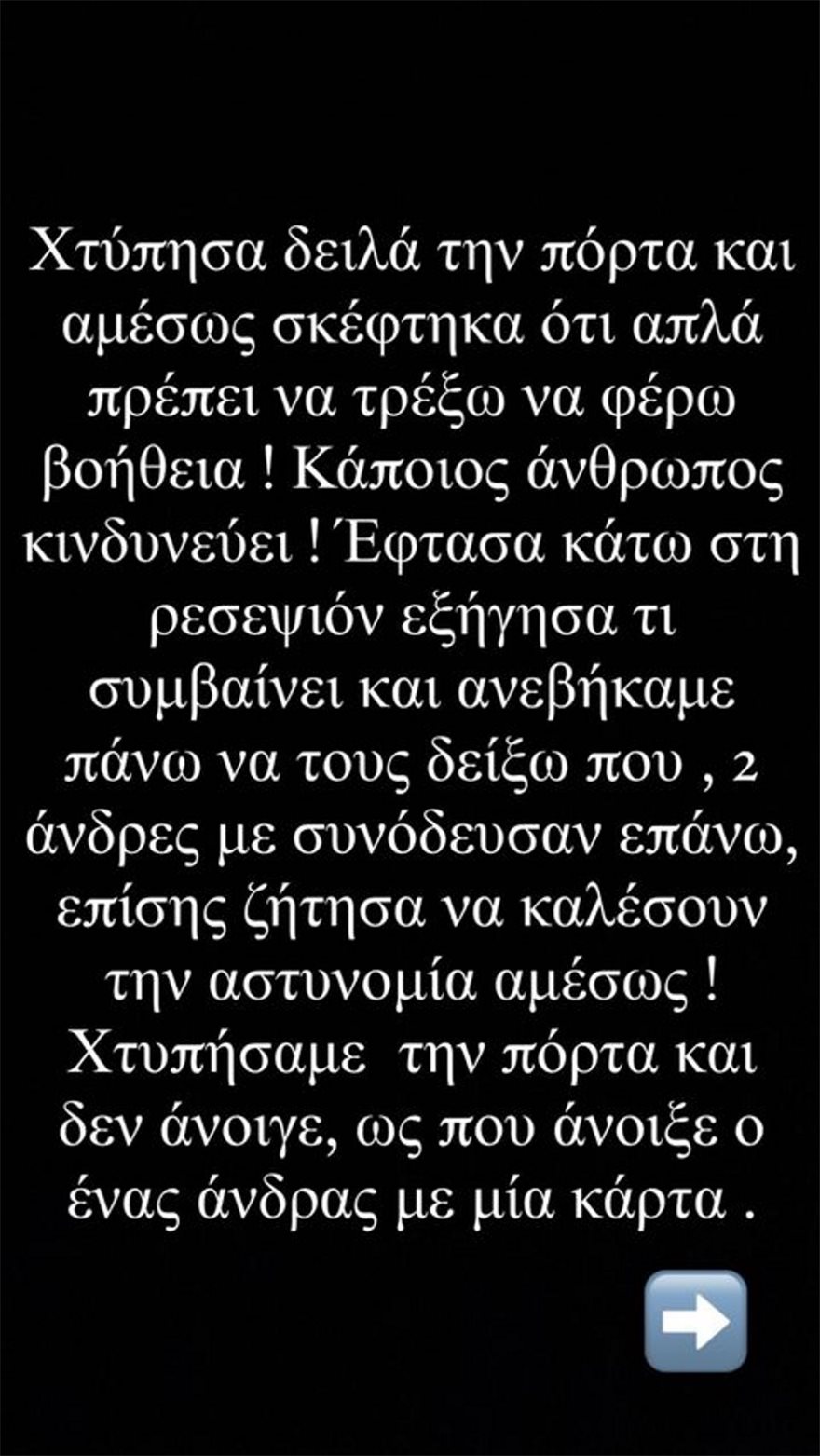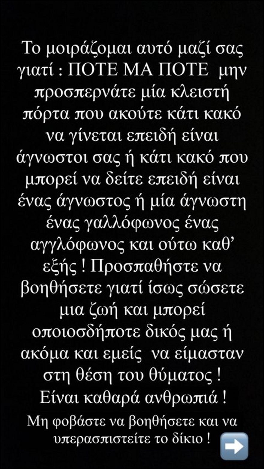 Το μοιράζομαι αυτό μαζί σας γιατί: ΠΟΤΕ μα ΠΟΤΕ μην προσπερνάτε μία κλειστή πόρτα που ακούτε κάτι κακό να γίνεται, επειδή είναι άγνωστοί σας ή κάτι κακό που μπορεί να δείτε, επειδή είναι ένας άγνωστός ή μία άγνωστη, ένας γαλλόφωνος, ένας αγγλόφωνος και ούτω καθ’ εξής! Προσπαθήστε να βοηθήσετε γιατί ίσως σώσετε μία ζωή και μπορεί οποιοσδήποτε δικός μας ή ακόμα και εμείς να είμασταν στη θέση του θύματος! Είναι καθαρά ανθρωπιά! Μη φοβάστε να βοηθήσετε και να υπερασιστείτε το δίκιο» έγραψε στο Instagram η Δήμητρα Αλεξανδράκη.