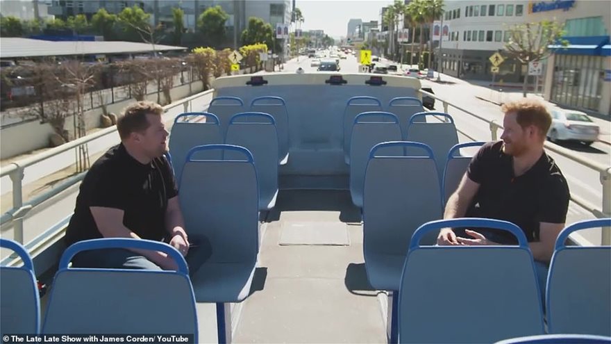Η αντισυμβατική συνέντευξη του πρίγκιπα Χάρι περιλάμβανε μια περιήγηση στο Λος Άντζελες με τουριστικό λεωφορείο συντροφιά με τον παρουσιαστή-κωμικό, και μία βιντεοκλήση με την Μέγκαν Μαρκλ, η οποία αποκάλεσε τον σύζυγό της «Χαζ» και υποστήριξε ότι «έχουν τελειώσει με τις μετακομίσεις».