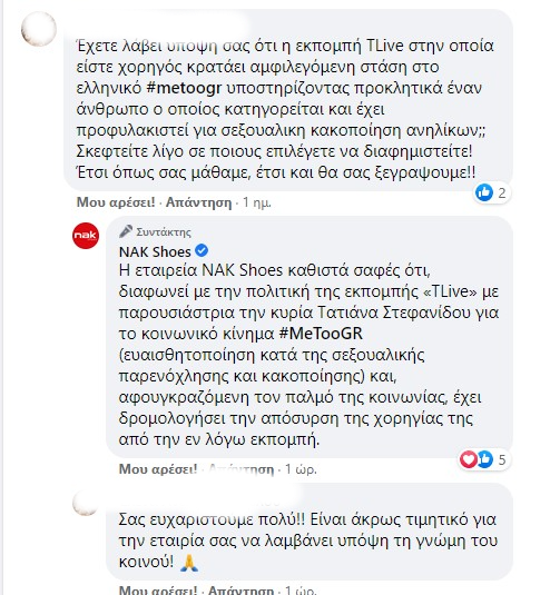 «Η εταιρεία NAK Shoes καθιστά σαφές ότι, διαφωνεί με την πολιτική της εκπομπής «ΤLive» με παρουσιάστρια την κυρία Τατιάνα Στεφανίδου για το κοινωνικό κίνημα #MeTooGR (ευαισθητοποίηση κατά της σεξουαλικής παρενόχλησης και κακοποίησης) και, αφουγκραζόμενη τον παλμό της κοινωνίας, έχει δρομολογήσει την απόσυρση της χορηγίας της από την εν λόγω εκπομπή».
