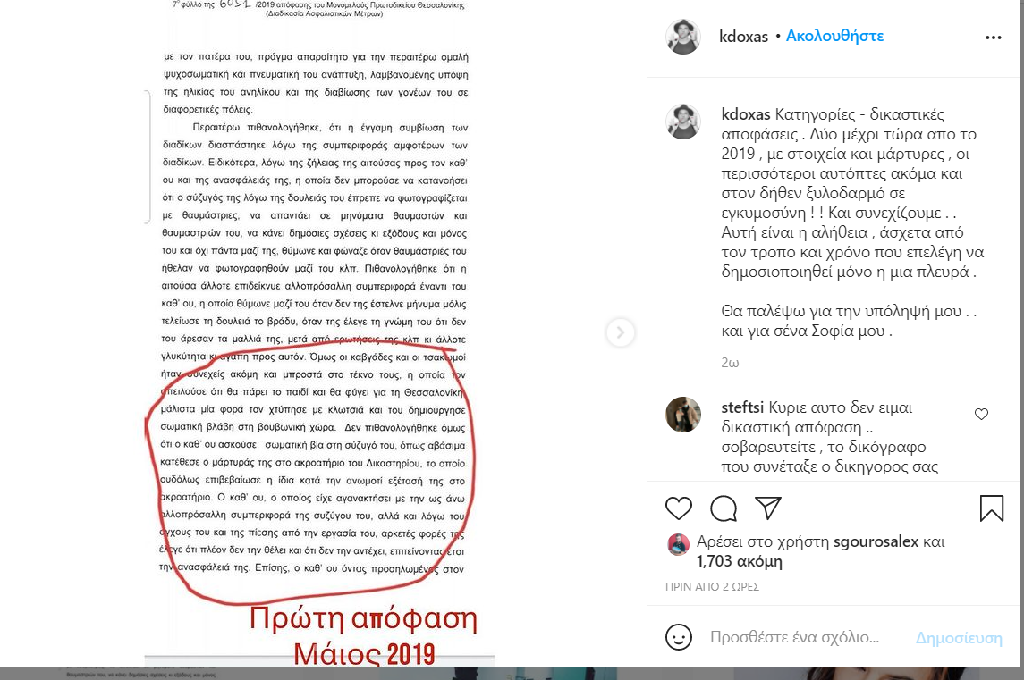 Μία ημέρα μετά τις καταγγελίες της πρώην συζύγου του και τις ανακοινώσεις τους για την υπόθεση, ανήρτησε μία δικαστική απόφαση του 2019 και μία του 2020. Στην πρώτη ανάρτηση, που αφορά απόφαση του Μονομελούς Πρωτοδικείου Θεσσαλονίκης, ο Κώστας Δόξας έχει κυκλώσει με κόκκινο μελάνι σημείο, στο οποίο αναφέρεται ότι η πρώην σύζυγός τον είχε κλωτσήσει στη βουβωνική χώρα και ότι ήταν αβάσιμη η μαρτυρία ότι εκείνος ασκούσε σωματική βία.
