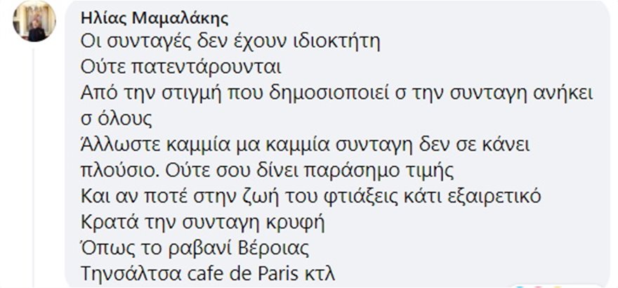 «Οι συνταγές δεν έχουν ιδιοκτήτη. Ούτε πατεντάρουνται. Από την στιγμή που δημοσιοποιείς την συνταγή ανήκει σ όλους. Άλλωστε καμία μα καμία συνταγή δεν σε κάνει πλούσιο. Ούτε σου δίνει παράσημο τιμής. Και αν ποτέ στην ζωή του φτιάξεις κάτι εξαιρετικό. Κρατά την συνταγή κρυφή. Όπως το ραβανί Βέροιας. Την σάλτσα cafe de Paris κτλ».