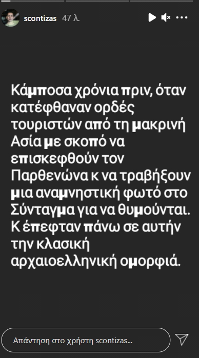 «Κάμποσα χρόνια πριν, όταν κατέφθαναν ορδές τουριστών από τη μακρινή Ασία με σκοπό να επισκεφθούν τον Παρθενώνα και να τραβήξουν μια αναμνηστική φωτό στο Σύνταγμα, για να θυμούνται.