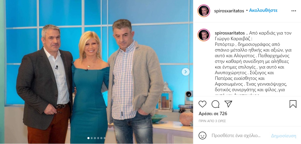 «Από καρδιάς για τον Γιώργο Καραιβάζ: Ρεπόρτερ, δημοσιογράφος από σπάνιο μέταλλο ηθικής και αξιών, για αυτό και Αλύγιστος . Πειθαρχημένος στην καθαρή συνείδηση με αλήθειες και έντιμες επιλογές, για αυτό και Ανυποχώρητος. Σύζυγος και Πατέρας ευαίσθητος και Αφοσιωμένος. Ένας γενναιόψυχος, δοτικός συνεργάτης και φίλος, για αυτό και Αγαπημένος. Λεβέντη μας η απουσία σου θα μας αφυπνίζει για πάντα» έγραψε ο Σπύρος Χαριτάτος.