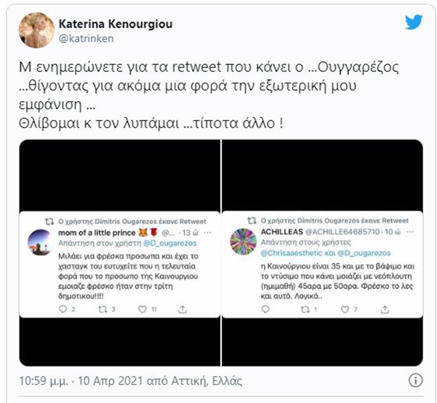 «Μ’ ενημερώνετε για τα retweet που κάνει ο Ουγγαρέζος θίγοντας για ακόμα μια φορά την εξωτερική μου εμφάνιση… Θλίβομαι κ τον λυπάμαι…τίποτα άλλο» έγραψε αρχικά και συμπλήρωσε: «Άκρως προσβλητικά για μια γυναίκα πόσο μάλλον να γίνονται από έναν άντρα και παρουσιαστή που βρίσκεται στην ίδια ζώνη με μένα…πόσο κρίμα».