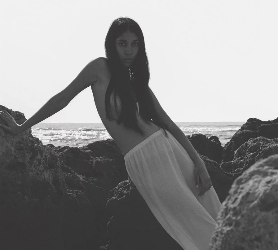 Το μελαχρινό μοντέλο ποζάρει τόπλες, φορώντας ένα λευκό παντελόνι και κρύβοντας τα επίμαχα σημεία με τα μακριά μαλλιά της και όποιος αντέξει.