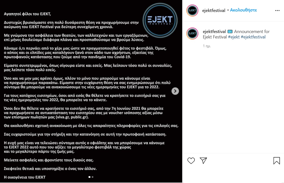 Με κάθε επισημότητα ανακοινώθηκε η ακύρωση του φετινού Ejekt Festival για δεύτερη σερί χρονιά, λόγω κορωνοϊού.