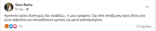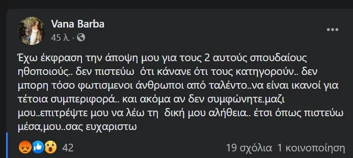 Στη συνέχεια, η Βάνα Μπάρμπα έκανε άλλη μια ανάρτηση, λέγοντας στους διαδικτυακούς της φίλους που αντιδρούσαν σε ό,τι είχε πει, γράφοντας το εξής: