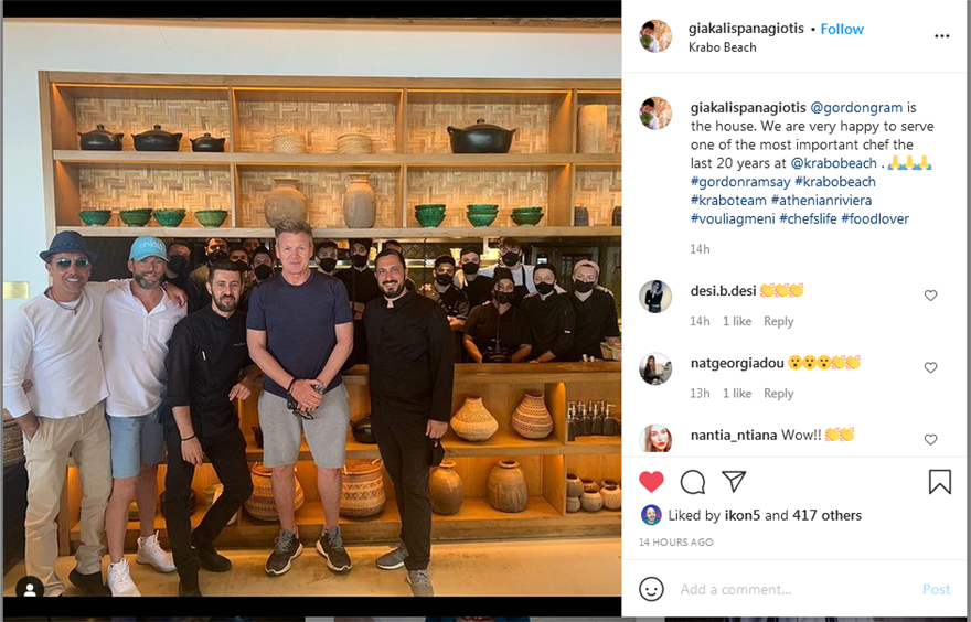Το μεσημέρι του Σαββάτου ο Ράμσει ήταν χαλαρός και αφού έφαγε ευχαρίστησε τον σεφ Παναγιώτη Γιακαλή και φωτογραφήθηκε μαζί με το team του εστιατορίου στο Καβούρι, πριν αποχωρήσει για το ξενοδοχείο του.