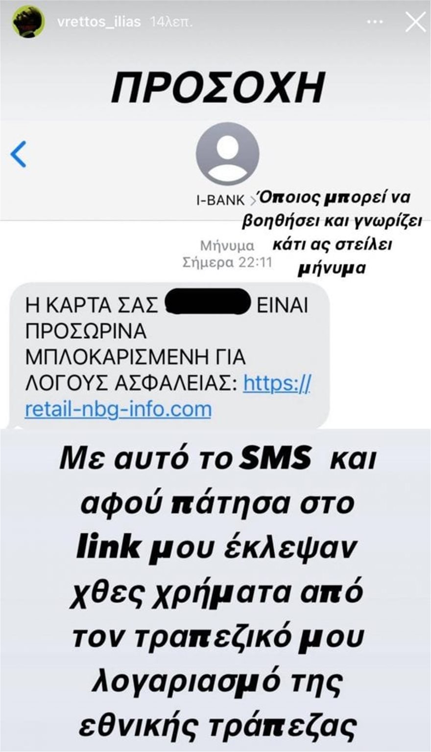 Σύμφωνα με τις πληροφορίες που έδωσε ο Ηλίας Βρεττός, έλαβε στο κινητό του ένα μήνυμα, το οποίο τον ενημέρωνε ότι η κάρτα του έχει μπλοκαριστεί. Συγκεκριμένα, έγραφε: «Η κάρτα σας είναι προσωρινά μπλοκαρισμένη για λόγους ασφαλείας», έχοντας δίπλα ένα λινκ, το οποίο παρέπεμπε στον λογαριασμό του.
