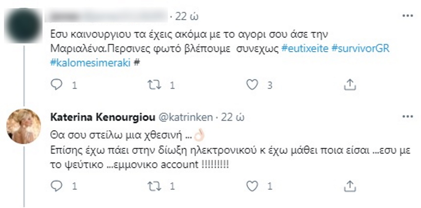 «Θα σου στείλω μία χθεσινή. Επίσης έχω πάει στην δίωξη ηλεκτρονικού κ έχω μάθει ποια είσαι …εσύ με το ψεύτικο …εμμονικό account!!».