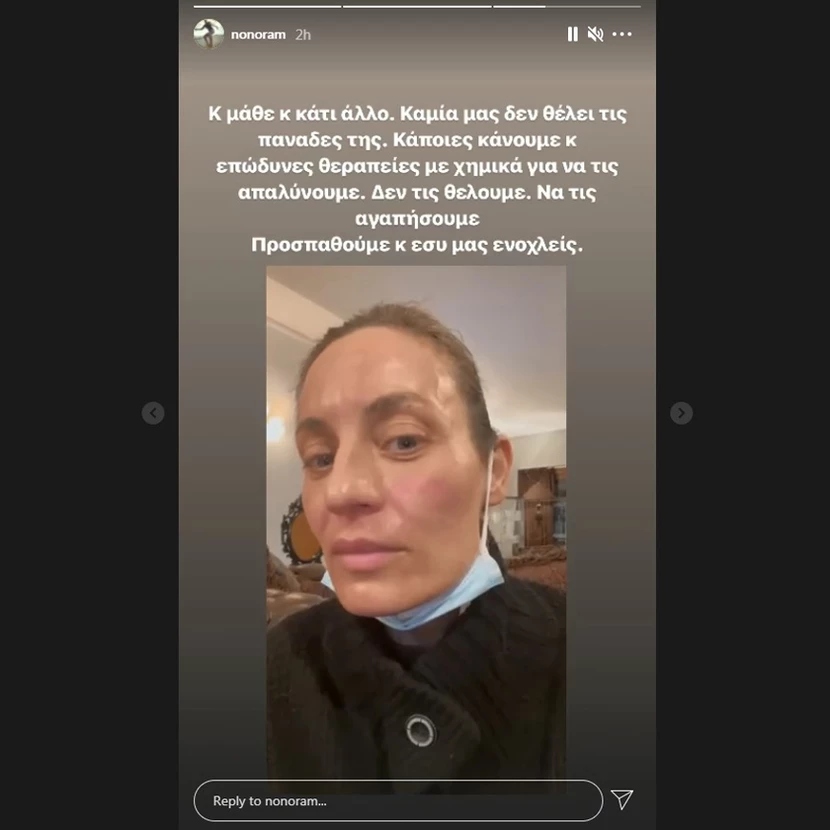 «Λατινοπούλου, άκου κάτι… Οι πανάδες που αποκαλείς “αντιαισθητικές” λέγονται επιστημονικά μελάγχρωση και έχουν παθολογικά αίτια, συχνά νόσου, ή τις αποκτά μια γυναίκα δώρο από την εγκυμοσύνη. Βγαίνουν παντού. Εμένα βγήκαν στο κούτελο και στο άνω χείλος. Κοινώς όταν με δει ο ήλιος, ναι έχω μουστάκι. Αλλά μάντεψε. Εμένα δεν με ενοχλούν τελικά, ούτε τον άντρα μου…