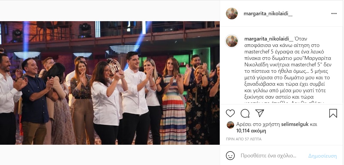 «Όταν αποφάσισα να κάνω αίτηση στο masterchef 5 έγραψα σε ένα λευκό πίνακα στο δωμάτιο μου “Μαργαρίτα Νικολαΐδη νικήτρια masterchef 5” δεν το πίστευα το ήθελα όμως… 5 μήνες μετά γύρισα στο δωμάτιο μου και το ξαναδιάβασα και τώρα έχει συμβεί και γελάω από μέσα μου γιατί τότε ξεκίνησε σαν αστείο και τώρα κρατάω το έπαθλο. Δεν θα σβήσω αυτά τα γράμματα από τον πίνακα με συγκινούν και πιο πολύ με συγκινεί που ενώ δεν άλλαξε τίποτα στο δωμάτιο μου μέσα σε ένα μόνο βράδυ αλλάζει σιγά σιγά η ζωή μου!