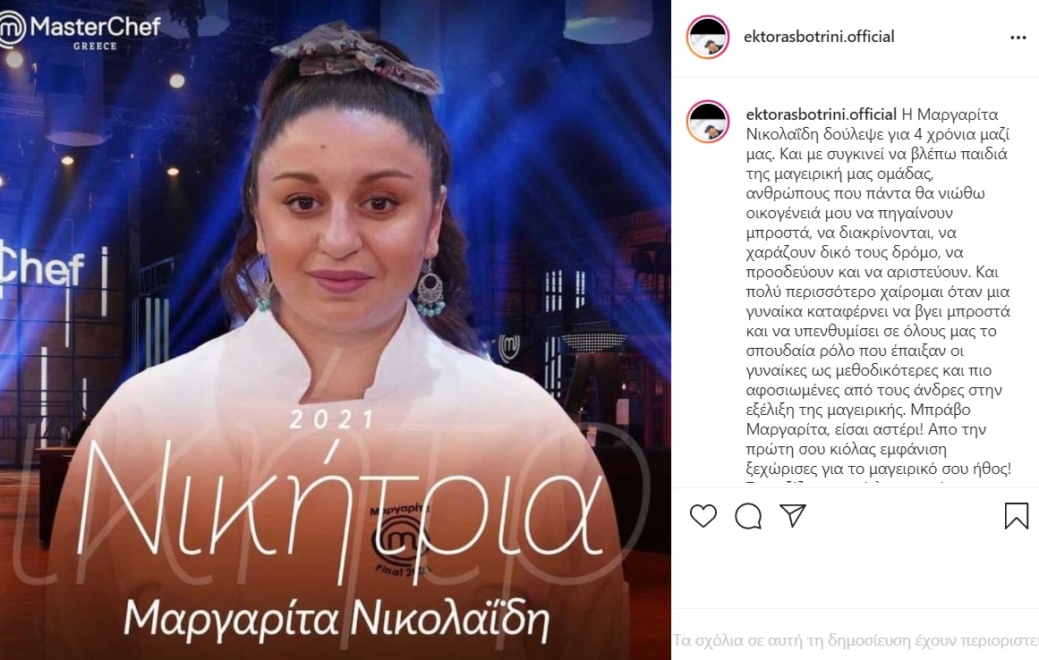 «Η Μαργαρίτα Νικολαΐδη δούλεψε για 4 χρόνια μαζί μας. Και με συγκινεί να βλέπω παιδιά της μαγειρική μας ομάδας, ανθρώπους που πάντα θα νιώθω οικογένειά μου να πηγαίνουν μπροστά, να διακρίνονται, να χαράζουν δικό τους δρόμο, να προοδεύουν και να αριστεύουν. Και πολύ περισσότερο χαίρομαι όταν μια γυναίκα καταφέρνει να βγει μπροστά και να υπενθυμίσει σε όλους μας το σπουδαία ρόλο που έπαιξαν οι γυναίκες ως μεθοδικότερες και πιο αφοσιωμένες από τους άνδρες στην εξέλιξη της μαγειρικής. Μπράβο Μαργαρίτα, είσαι αστέρι! Από την πρώτη σου κιόλας εμφάνιση ξεχώρισες για το μαγειρικό σου ήθος! Τον αξίζεις τον τίτλο σου πέρα ως πέρα!», έγραψε ο Έκτορας Μποτρίνι.