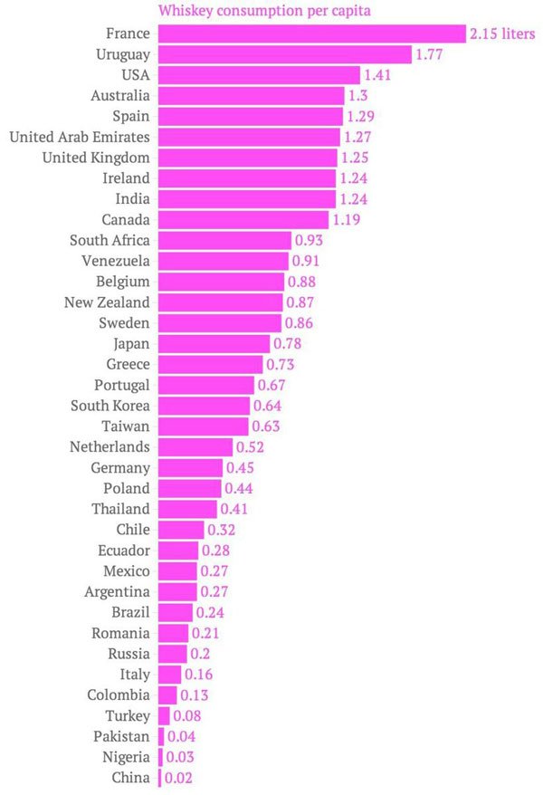 Παρά τις διακηρύξεις ότι το ουίσκι είναι κομμάτι του αμερικανικού πνεύματος, οι Αμερικάνοι δεν είναι στην κορυφή της λίστας, αλλά αρκετά κοντά. Οι κορυφαίες διακρίσεις πάνε στη Γαλλία, που δείχνει την προτίμησή της και στο ουίσκι. Παραδόξως τα Ηνωμένα Αραβικά Εμιράτα είναι μεταξύ αυτών που λατρεύουν το ουίσκι, κάτι που οφείλεται στην αύξηση των μη μουσουλμάνων αλλά και των ομογενών στη χώρα.