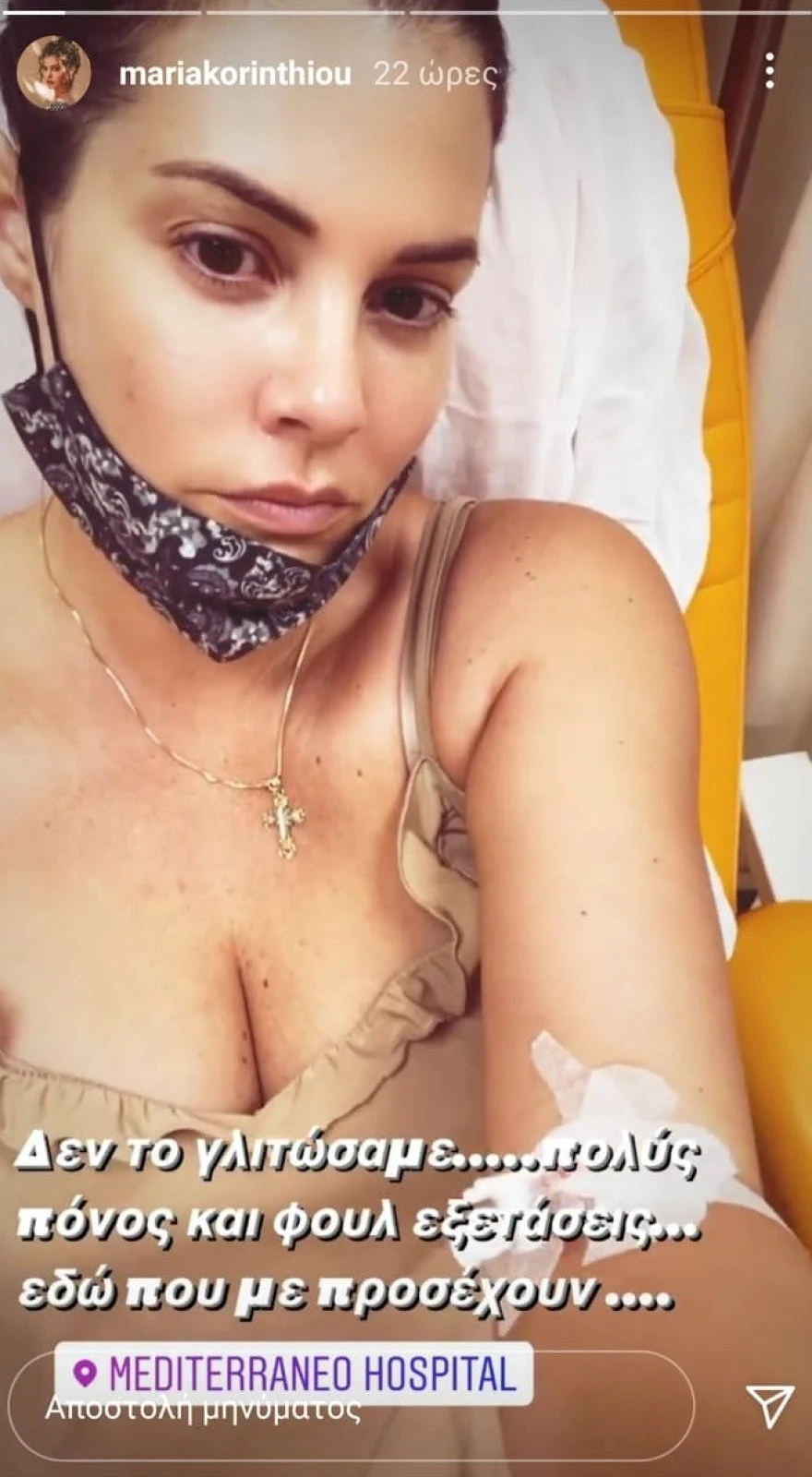 «Δεν το γλιτώσαμε… πολύς πόνος και φουλ εξετάσεις… εδώ που με προσέχουν» έγραψε στο στιγμιότυπο η Μαρία Κορινθίου.