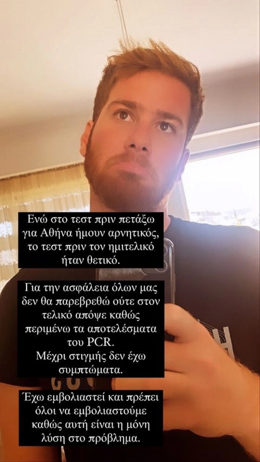 «Ενώ στο τεστ πριν πετάξω για Αθήνα ήμουν αρνητικός, το τεστ πριν τον ημιτελικό ήταν θετικό. Για την ασφάλεια όλων μας, δεν θα παραβρεθώ ούτε στον τελικό απόψε καθώς περιμένω τα αποτελέσματα του PCR. Μέχρι στιγμής δεν έχω συμπτώματα. Έχω εμβολιαστεί και πρέπει όλοι να εμβολιαστούμε, καθώς αυτή είναι η μόνη λύση στο πρόβλημα», έγραψε χαρακτηριστικά o Τζέιμς Καφετζής.