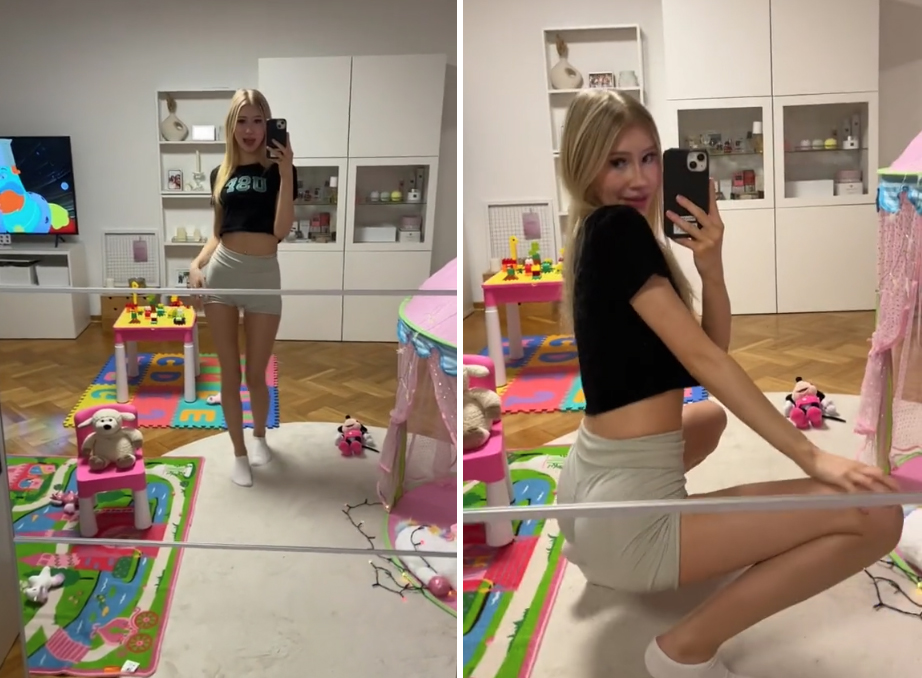 Στο βίντεο με τίτλο «Θα με προσλάμβανες;» — η ξανθιά βόμβα ποζάρει στον καθρέφτη ενός παιδικού δωματίου, φορώντας ένα μαύρο crop top και γκρι μίνι σορτς.