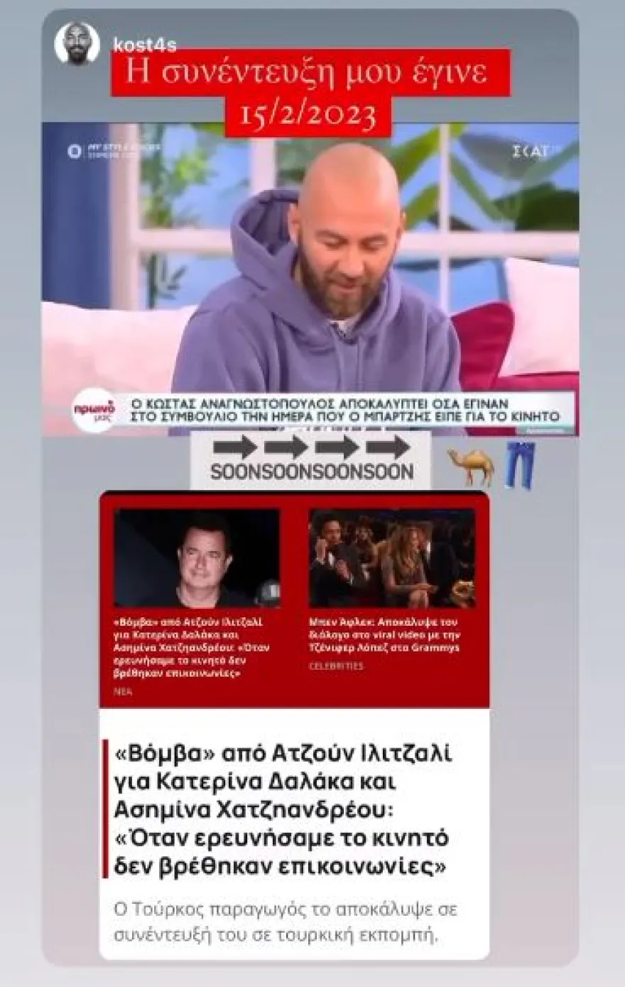 Σε δεύτερο story, μοιράστηκε ένα απόσπασμα από τη συνέντευξη του Κώστα Αναγνωστόπουλου από τις 15 Φεβρουαρίου στο «Πρωινό μας», όπου και υποστήριζε ότι ούτε η Δαλάκα, αλλά ούτε και η Χατζηανδρέου είχαν κάποια επικοινωνία εκτός παιχνιδιού.