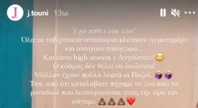 Η πρώην παίκτρια του «My Style Rocks», ούσα απογοητευμένη δήλωσε πως: «Έχω πάθει σοκ εδώ. Όλα τα ταβερνάκια εστιατόρια κλείνουν το μεσημέρι και ανοίγουν το απόγευμα. Και είναι hight season 1 Αυγούστου. Ο κόσμος δεν θέλει να δουλέψει. Μάλλον έχουν πολλά λεφτά οι Παξοί. Τέλος πάντων, απ΄ ότι καταλάβατε πήγαμε σε ένα από τα μοναδικά που λειτουργούσαν αυτή την ώρα και φάγαμε».